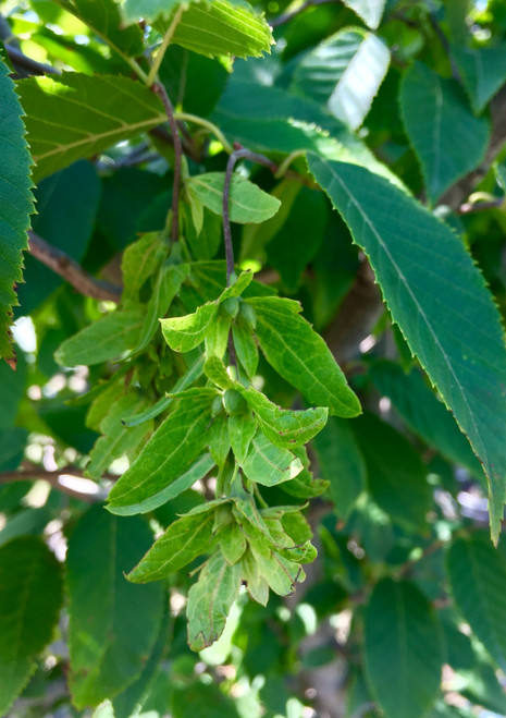 American hornbeam is a native understory tree that thrives in shaded, moist conditions. It is valued for its globe-like architecture, adaptability, and reliability. After catkins appear in spring, clusters of chartreuse winged nutlets form under elliptical dark green leaves. By autumn, nutlets fade to brown and the foliage turns shades of yellow, red, and orange. American hornbeam is clay tolerant, does well under black walnuts, and has little to no pests or disease.