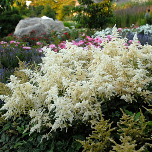 'Deutschland' astilbe is the perfect thing to lighten up an area of the shade garden. It has delicate plumes of white flowers that make excellent cut flowers and blooms just before hostas start dominating the landscape. Compound leaves grow together in a mounding habit and stay medium green throughout the growing season. It prefers moist, well drained soils and benefits from partial shade through the day, even tolerating deep shade. It is deer and rabbit resistant and very low maintenance. Stunning when massed together in full bloom.