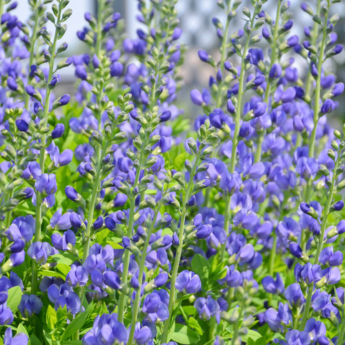 False indigo is one of the best blue flowers for Iowa landscapes and does extremely well in most soil conditions. Trifoliate, blue-green clover-like foliage is seen throughout the growing season and in spring, plants are covered in tall, slender towers of blue pea-like flowers. Seed pods mature to a charcoal-black and add great texture to the landscape and to dried flower arangements. False indigo grows best in average, well-drained soils in full sun to part shade but can tolerate poor, chalky, and droughty soils too. No major insect/disease issues.