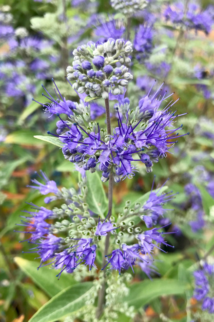 One of the few shrubs that has blue flowers, bluebeard is also notable for its drought tolerance and ability to attract masses of butterflies. It is characterized by fluffy spires of sweetly scented blue flowers in summer that seem to bloom off and on until frost. Masses of dark blue-green leaves (with silvery undersides) cover the dwarf shrubs which adds to its usefulness tucked amidst perennials. Bluebeard does best in very well-drained soils in full sun and are often disease/insect resistant. Blooms occur on new growth and thus can be pruned back in spring.