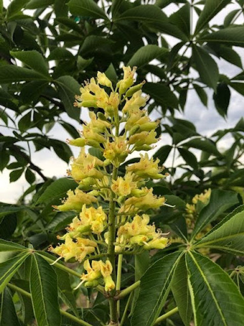 The Early GlowTM Buckeye is an improved cultivar of the Ohio Buckeye. It is an enduring and beautiful, small or medium sized deciduous shade tree that provides interest through the seasons. Early Glow Buckeye produces showy yellow-green flowers in the spring that rise on spikes above the foliage. This improved variety does not produce many, if any, buckeye fruits. Combined with its adaptability to different environmental conditions and soils, this makes it a great candidate for use as a street tree. The unusual coarse foliage and blooms provide interest and dense shade. If planted as a street tree, the crown should be raised when the lower branches are still small to avoid damaging the tree. It shows excellent resistance to leaf scorch and leaf blotch; and has radiant orange and red fall color. It should be noted that all parts of this tree are poisonous, so it should not be planted where livestock or other animals can graze on it.