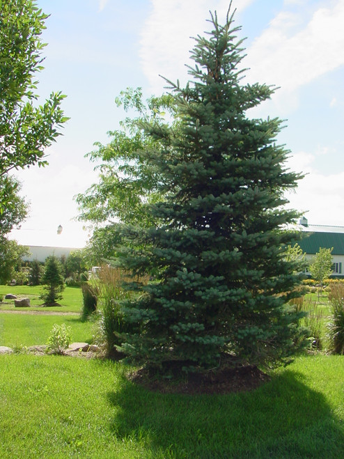 Colorado blue spruce are sought after trees due in part because of their blue hue and winter interest. They are a very stately tree, forming a pyramidal shape with horizontal branching. This Rocky Mountain native is recognized by its stiff, short blue-green needles that surround the branches. In maturity, grey bark can be furrowed and small, conical brown cones will form in the upper canopies. Blue spruce prefer acidic, well-drained soils in full sun, however they will tolerate periods of drought and some light shade if good growing conditions are met. They will do best if soils are allowed to be consistently moist, provided water drains freely. Cooler climates often produce bluer needles.