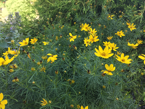 Threadleaf coreopsis is one of our most popular choices for Midwest gardens because of its length of bloom, hardiness, and vigor. Plants thrive on neglect and are at home in poor soils; tolerating drought, heat, and humidity. 'Zagreb' has cheery, bright yellow daisy-like flowers that cover the plants through the summer like a mist and are held above thread-like dark green foliage. Coreopsis is virtually disease and insect resistant and is not palatable to deer. Looks best when massed or left to naturalize and makes great accent plants for the rock garden.