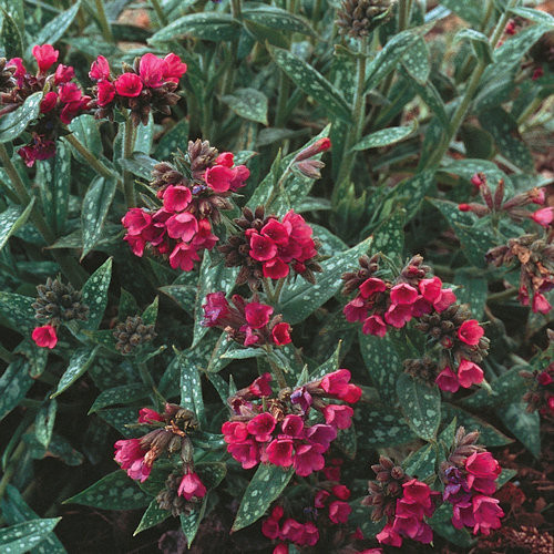 Lungwort have been long favorites of gardeners for the spotted foliage. Like hostas, most grow them for the leaves alone - however they have very beautiful pink, drooping flower clusters in early spring. Silver, irregular spots cover the dark green lanceolate leaves the rest of the growing season. Lungwort do best in moist, well-drained soils in shade and a layer of mulch is best to help maintain consistent moisture levels. 'Raspberry Splash' has a profusion of raspberry-coral blooms held on arching sprays appears above the lush silver-spotted foliage throughout spring. Works well to create a lush underplanting to hostas and ferns. Resistant to powdery mildew. An herbaceous perennial.