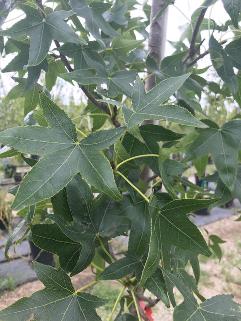 'Moraine' sweetgum was selected for its cold hardiness, compact habit, and better foliage color. This North American native is well known for its leaf shape, spiky fruit, and extraordinary fall color. The glossy, green leaves are star shaped and change to a brilliant mix of reds, purples, and yellows in autumn. Insignificant flowers appear in spring and the female flowers morph into spiky, gumball-like fruits that can persist into winter. Sweetgum prefer moist, well-draining acidic soils in full sun to part shade. A thick layer of mulch will help benefit moisture retention in the soil. Sweetgum can have shallow root systems.